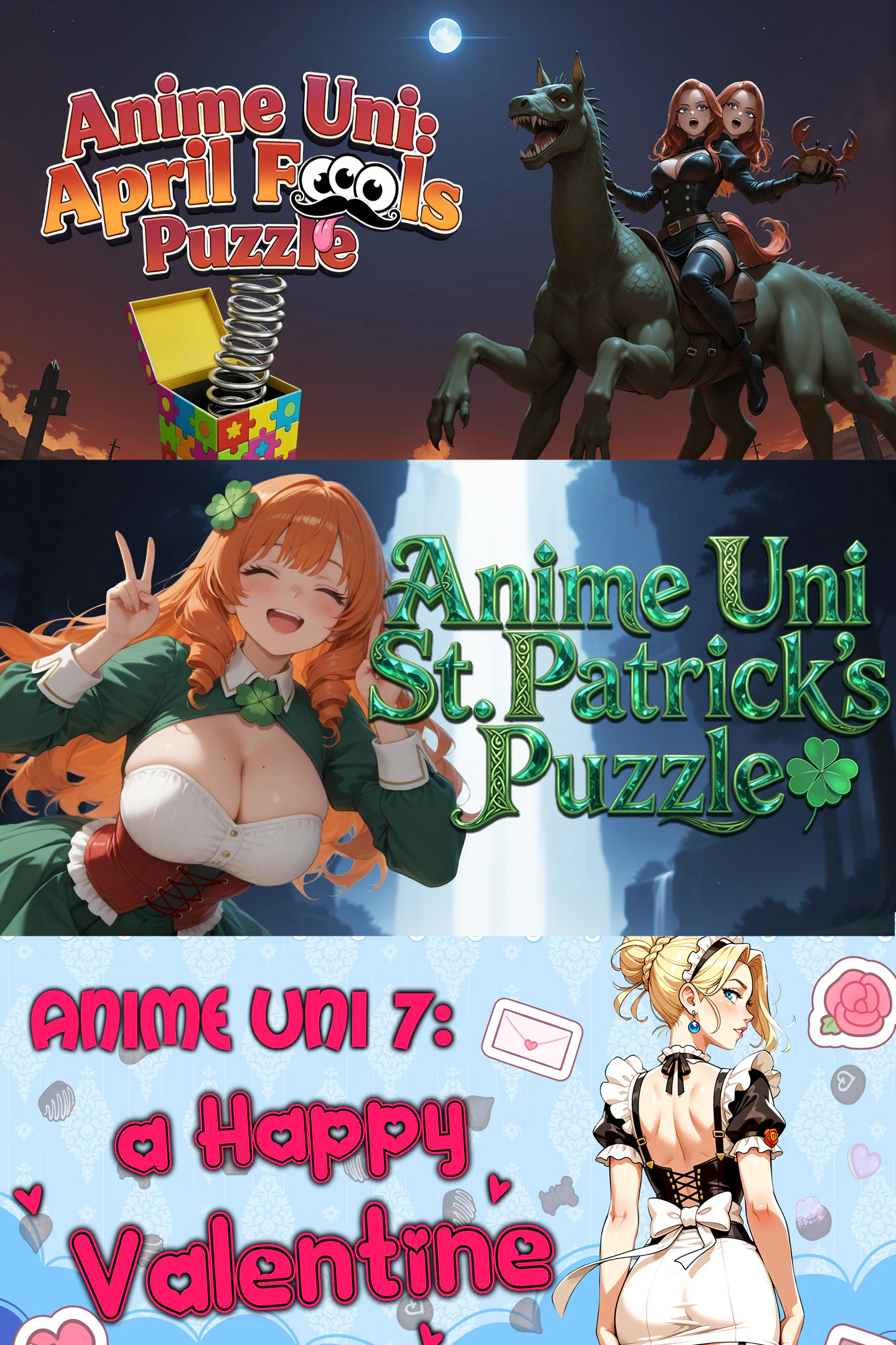 This bundle includes: Anime Uni 7: a Happy Valentine, Anime Uni St. Patrick's Puzzle, and Anime Uni: April Fools Puzzle — three games from the Anime Uni series where you can relax by solving simple puzzles accompanied by pleasant music.