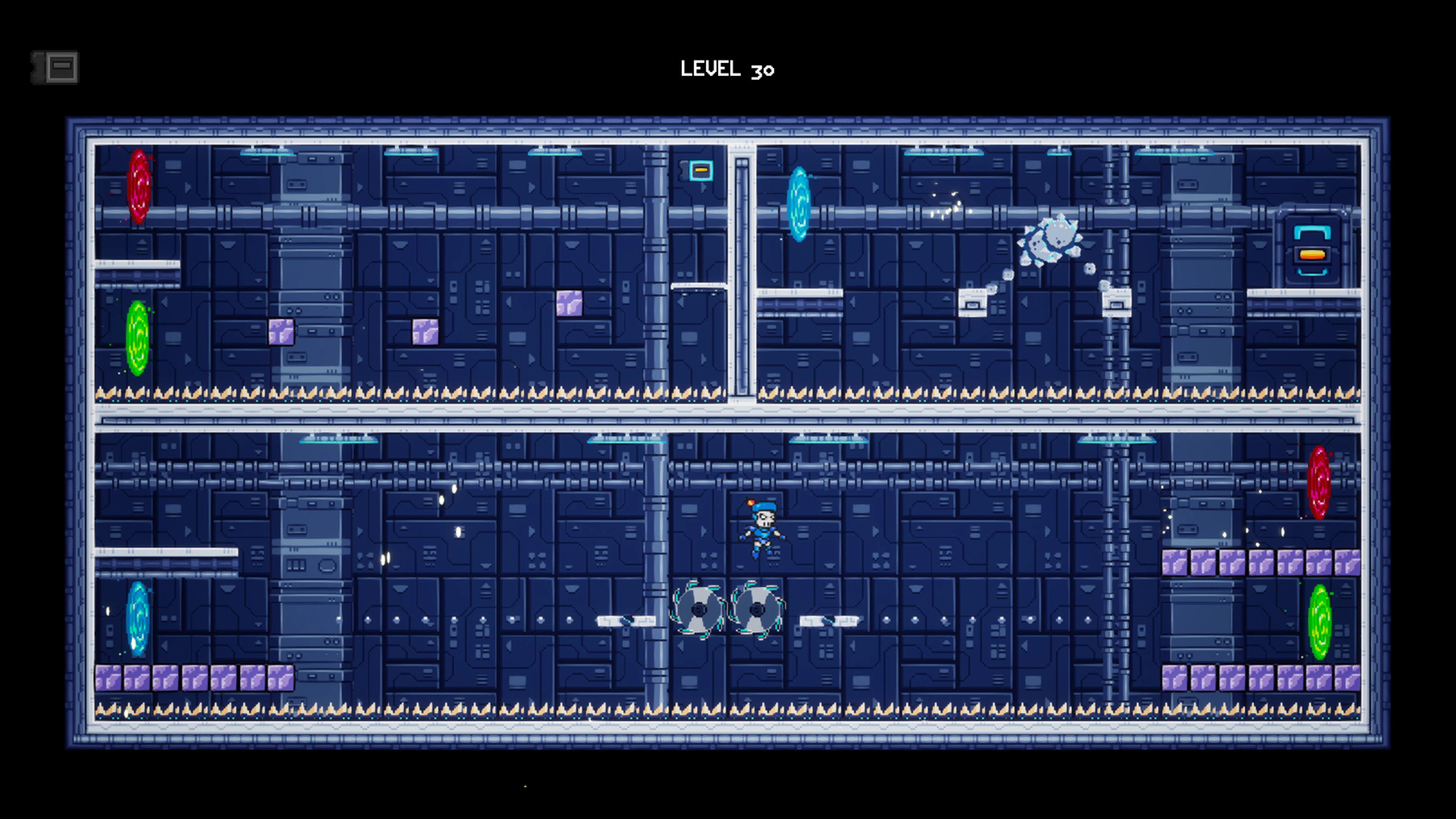 Across 30 progressively challenging levels, you must analyze each single-screen stage, plan your route, collect the access card, and reach the exit door while avoiding a wide variety of hazards. Spikes, lasers, rotating saws, falling platforms, and complex mechanical traps demand sharp reflexes, perfect timing, and full mastery of your abilities.