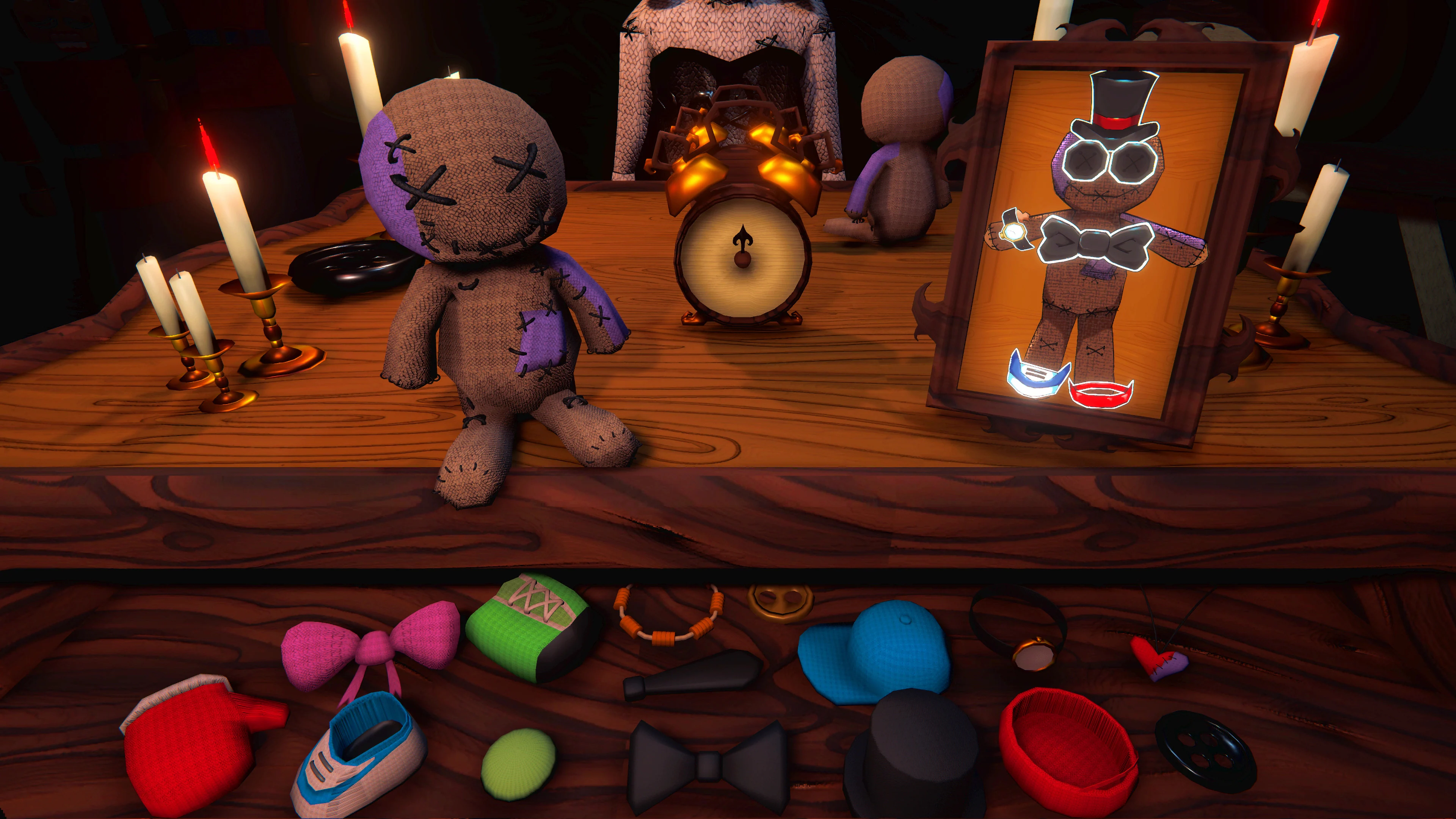 To survive, you must prove your skills as a master builder. Analyze the eerie photographs she presents to you and race against the ticking clock to replicate them perfectly. From the drawer of discarded parts, you must select the correct eyes, hats, clothing, and accessories to assemble the requested toy.