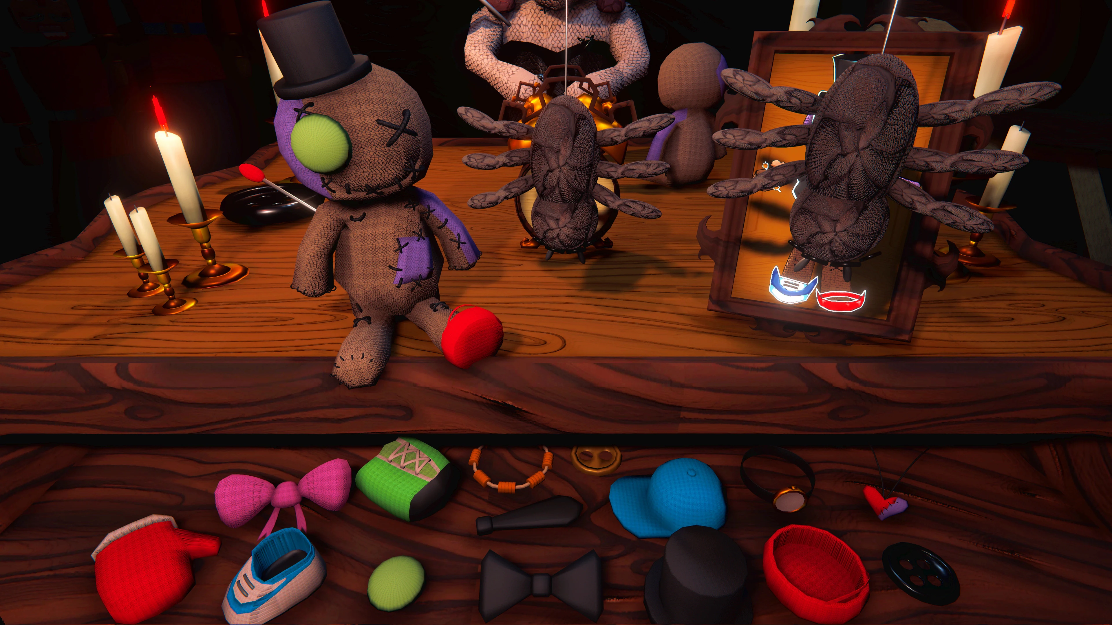 You wake up in an enormous, shadow-drenched room filled with the forgotten playthings. Seated across from you at a small wooden table is the Dollmaker – a mysterious, stitched-together doll who is missing an eye. She is your adversary, and you have been chosen to play her macabre game.