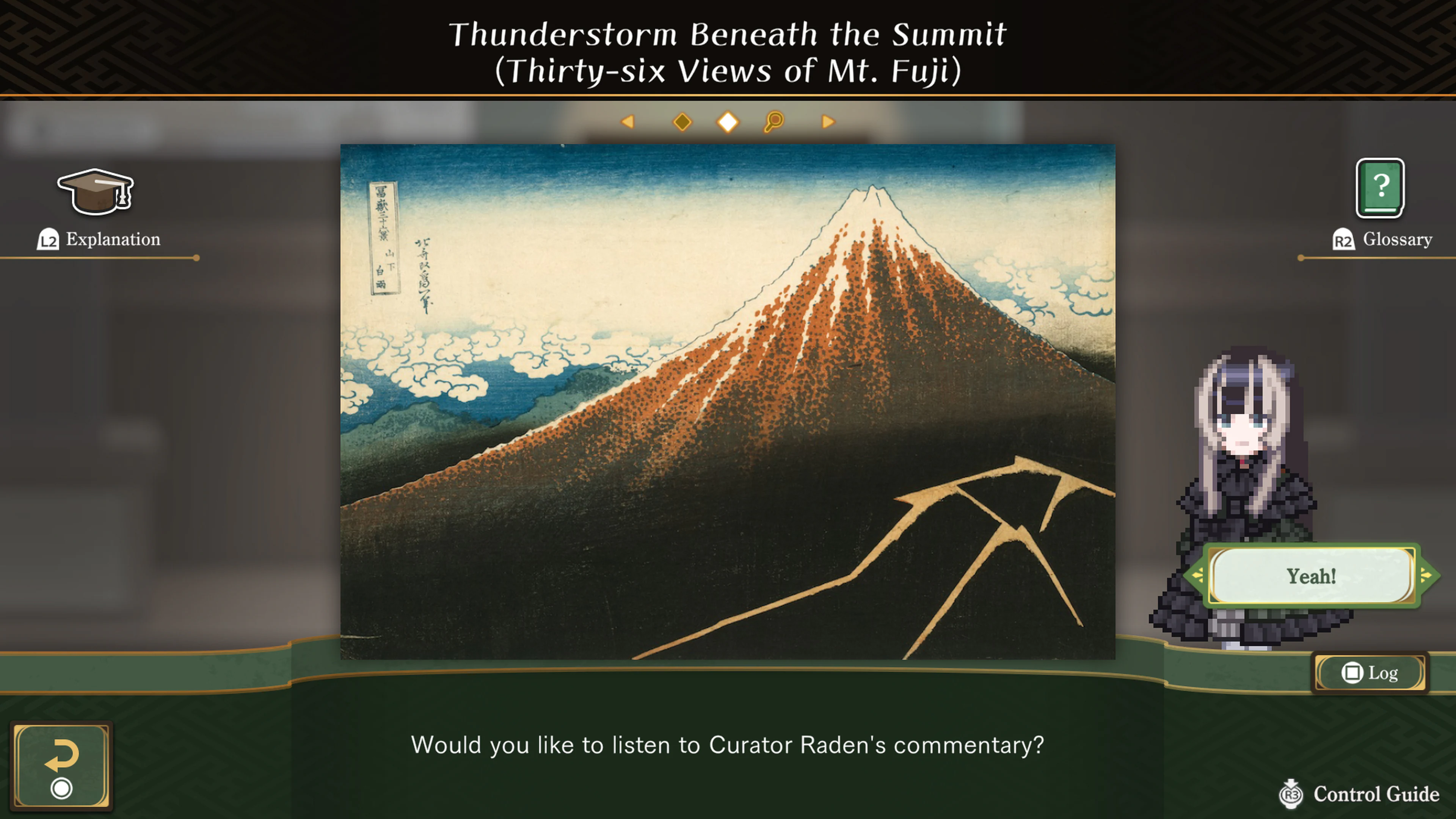 The entire game world, including Curator Raden and the museum, is depicted in "pixel art".