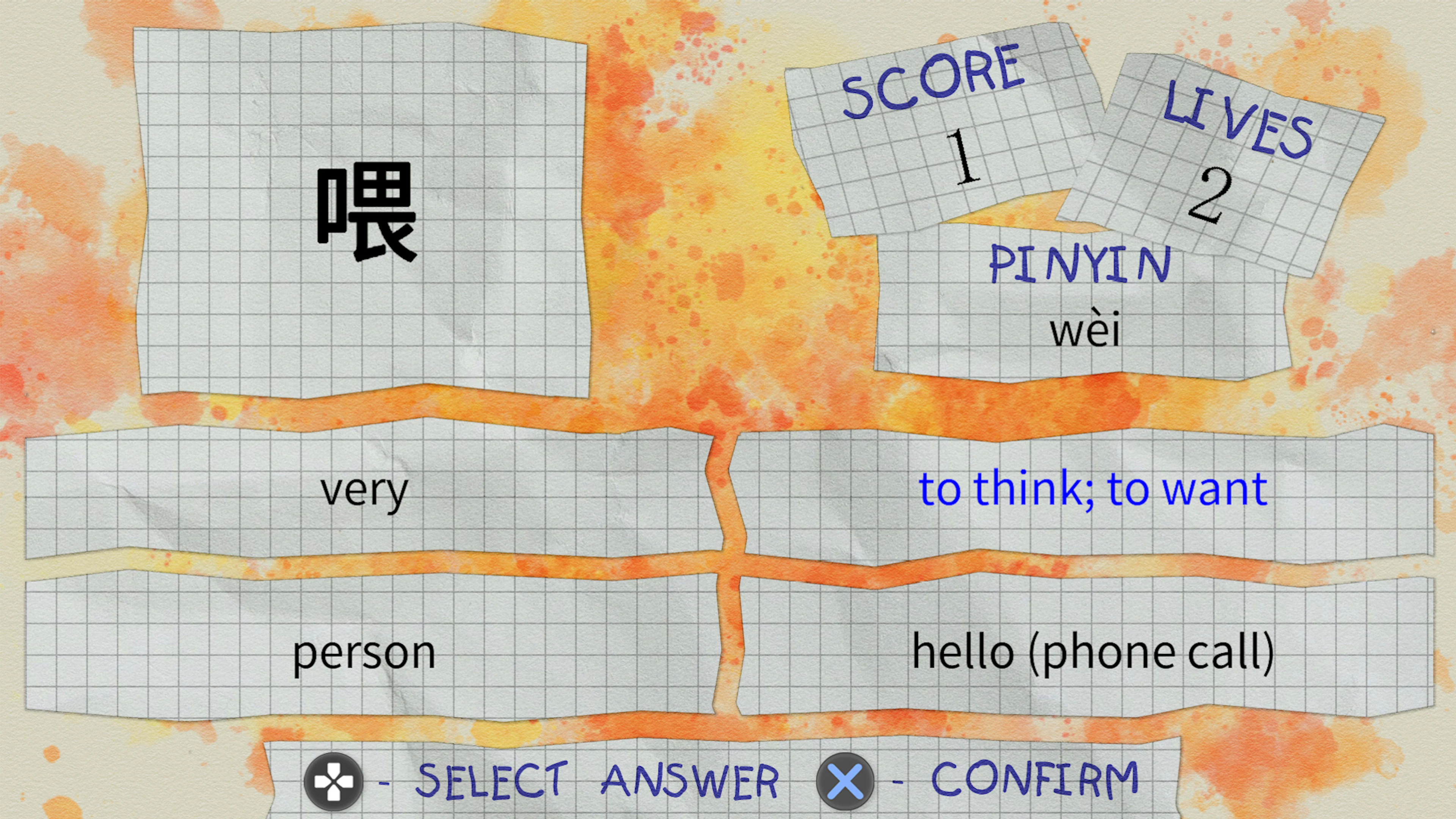 "Learn Basic Mandarin!!" is a game that helps to memorize 150 first level Mandarin Chinese words. The game also includes pinyin (their spelling) and a list of all the words. You have 5 lives which deplete after each wrong answer. Try to get the highest possible score.