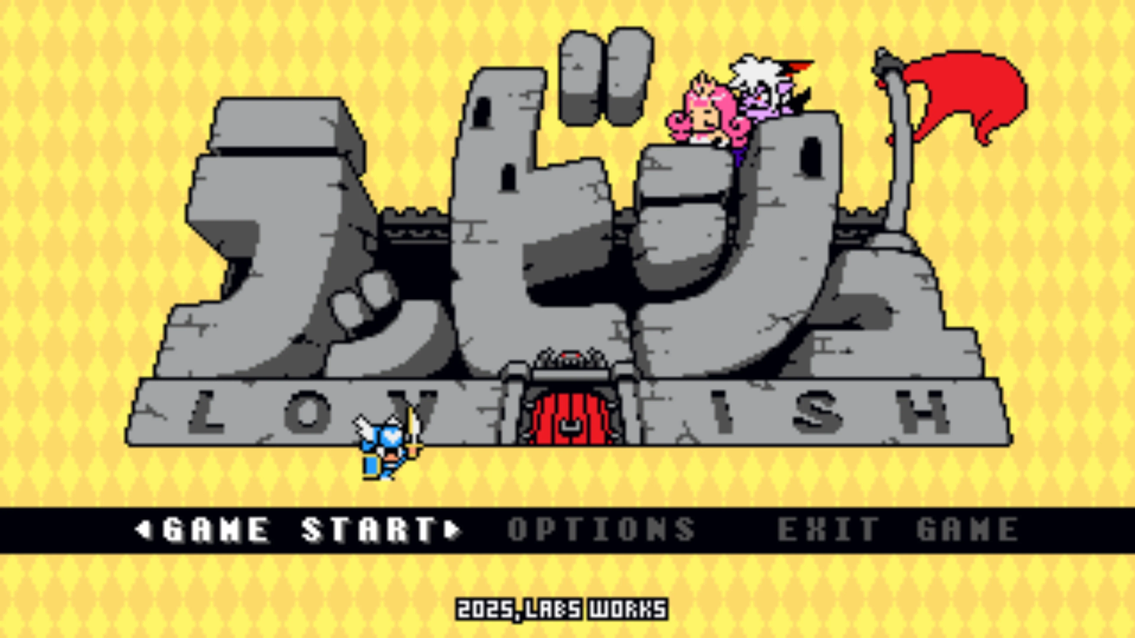 Lovish is an outrageous 8-bit action-adventure game! Quest with Sir Solomon through a series of bite-sized rooms, as he attempts to free Princess Tsuna, the woman he loves, from the Devil Lord's clutches!