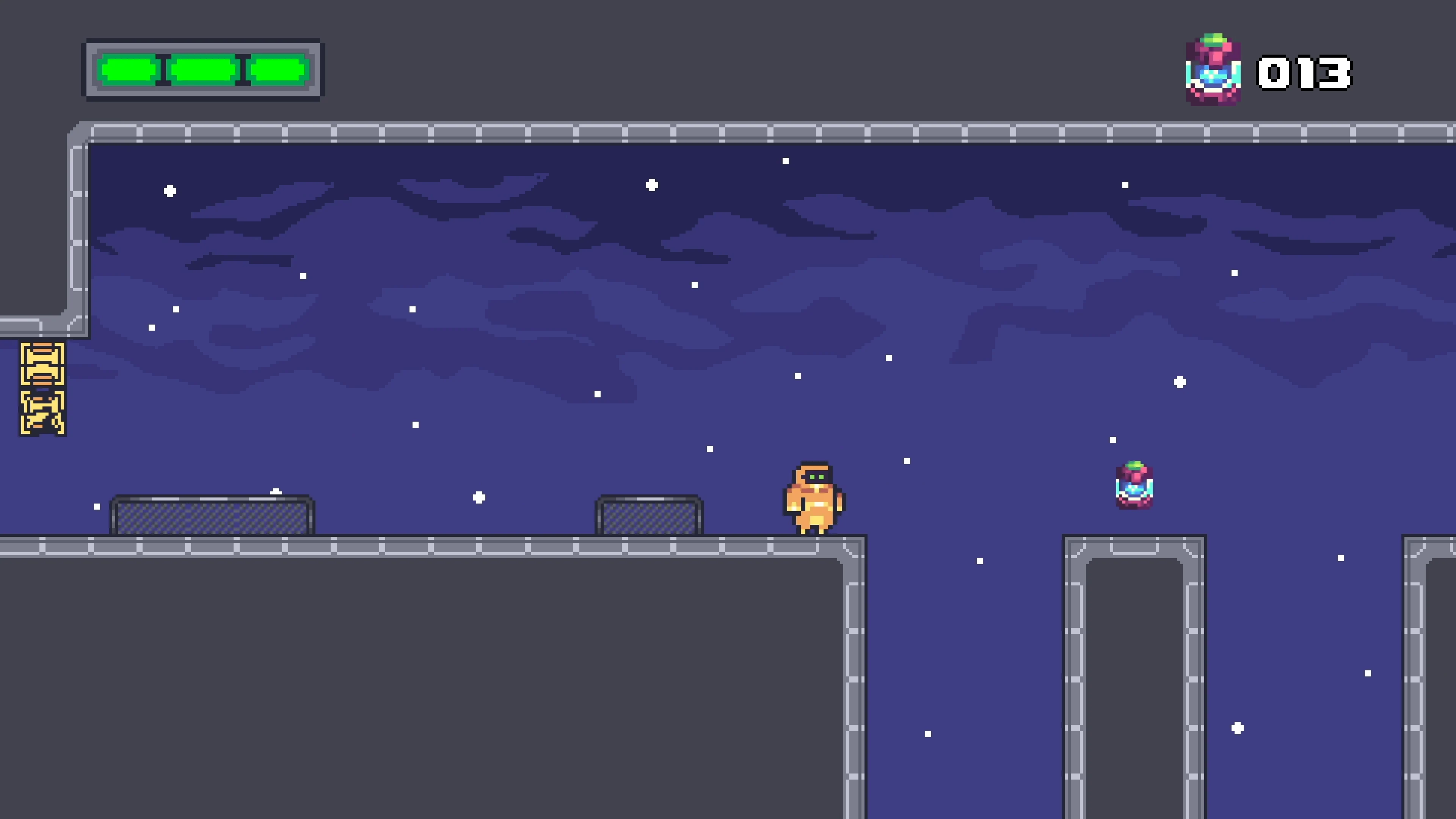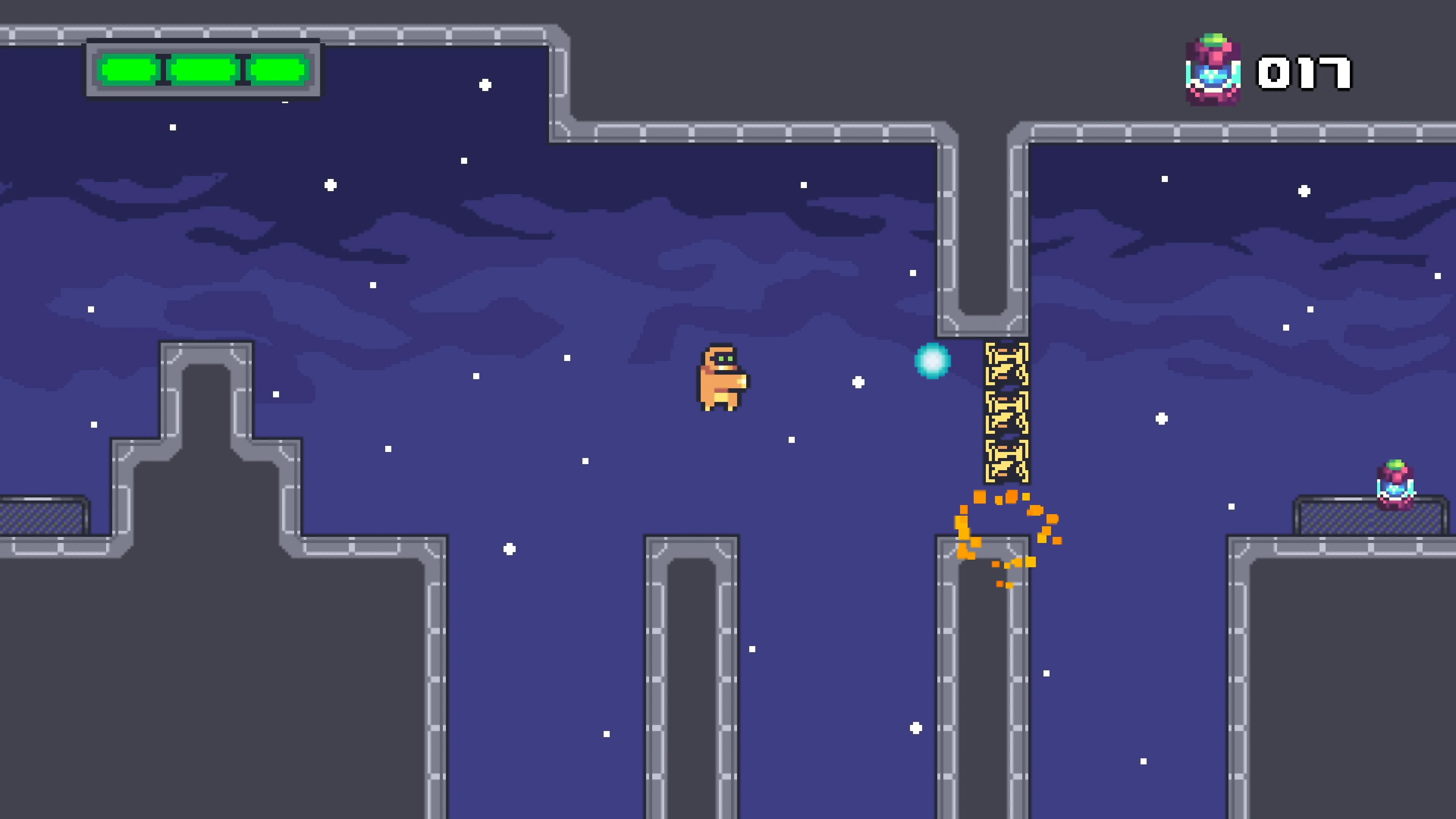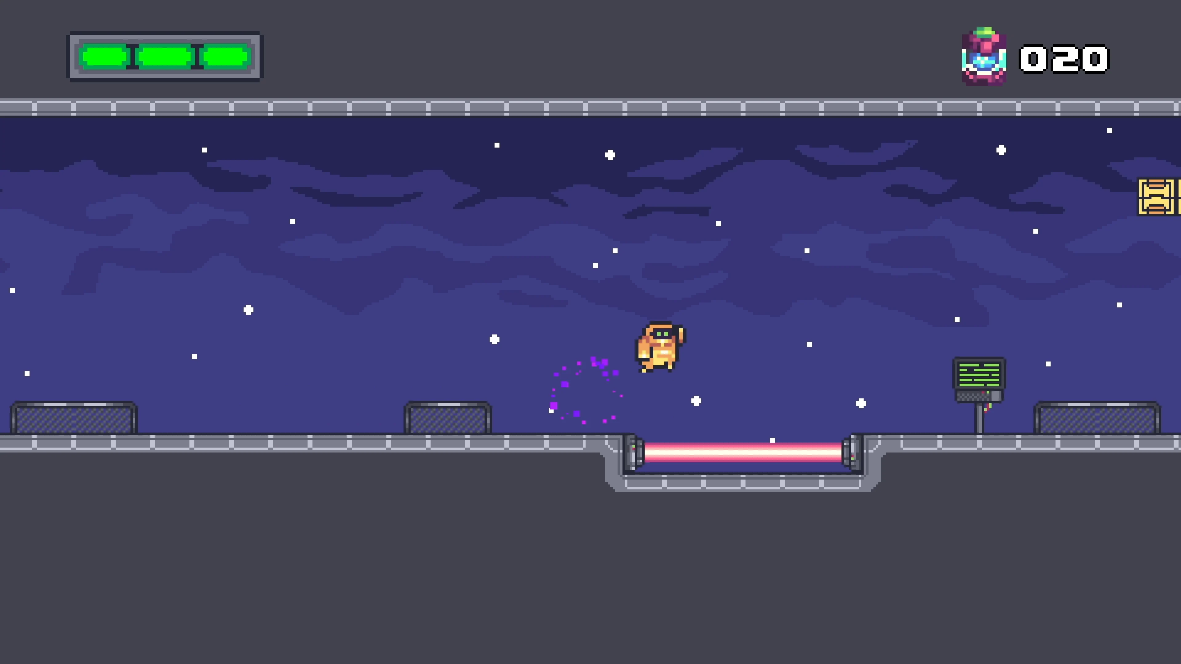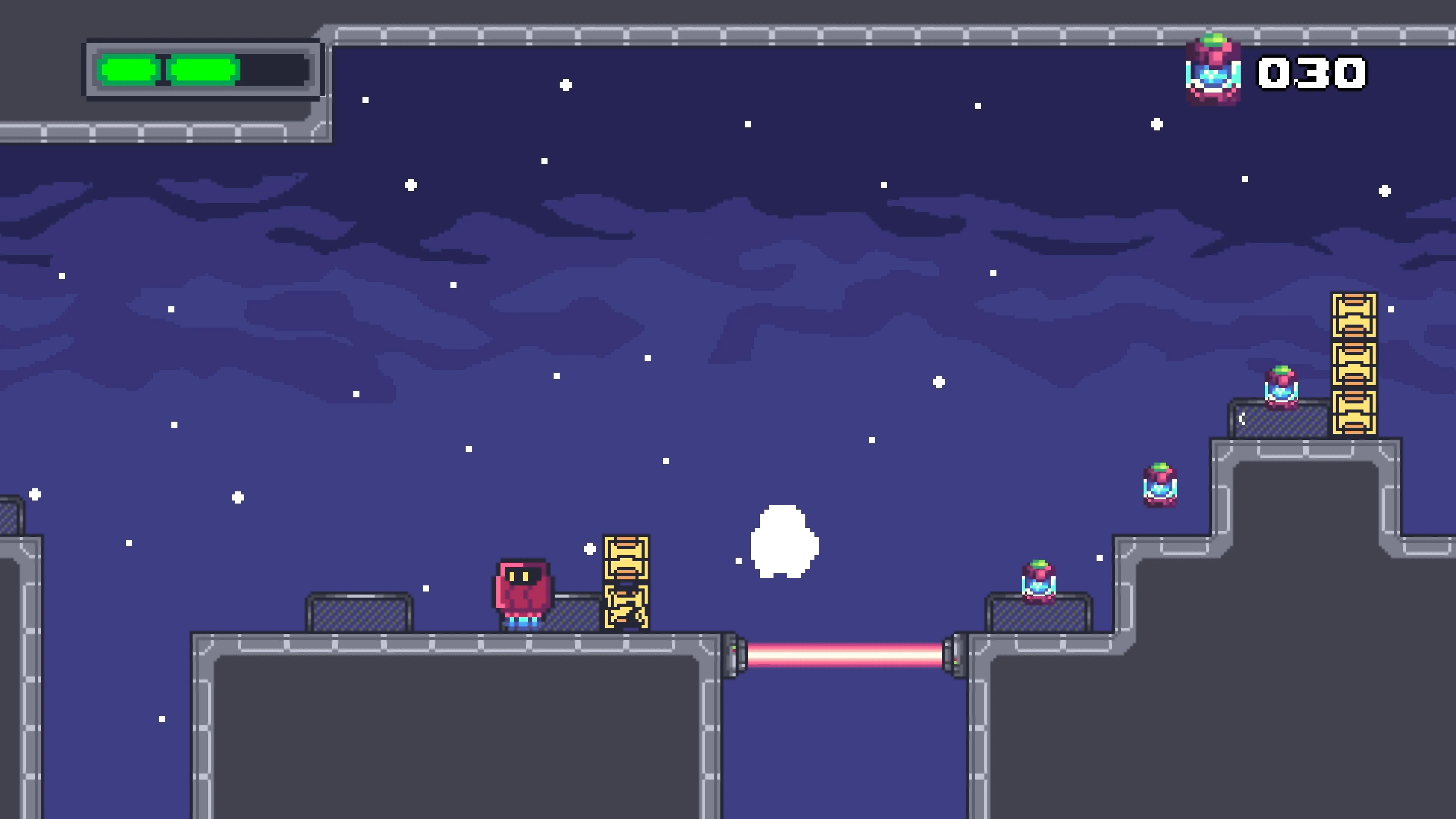 2D side-scrolling platformer where you play a little robot who can shoot with his cannon arm to destroy boxes and enemies alike. Run, jump, shoot, collect batteries or bonus life and reach the heart machine at the end of the level. You'll also encounter pitfall, laser or saw traps, and laser canon along your way to escape your prison ship into space.