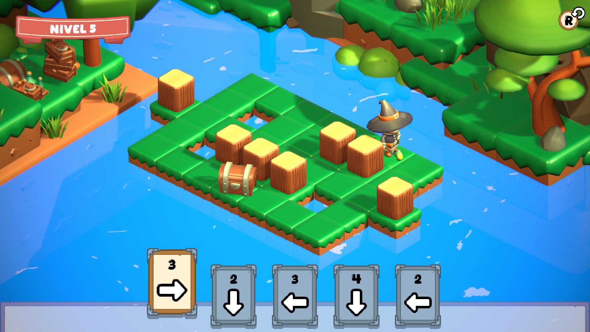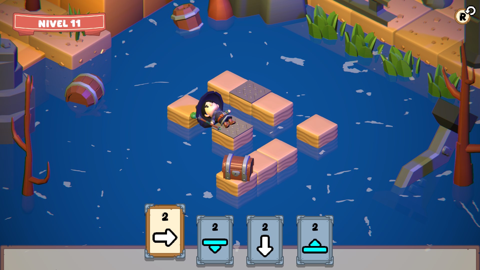 If you run out of cards before reaching the treasure, you must restart the stage. But don’t worry: there is always a possible path. It’s up to you to discover it!