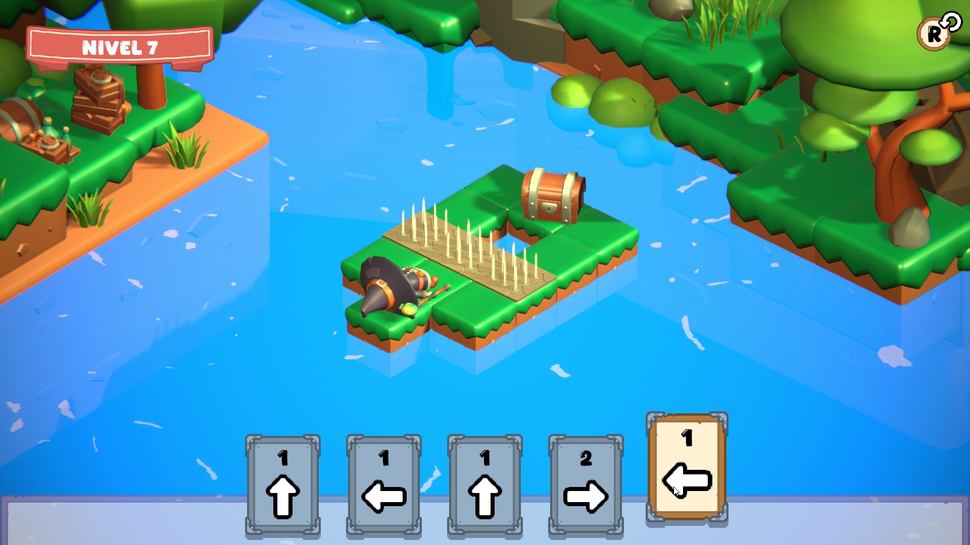 In this challenging strategy game, each card represents a movement. Choosing the correct sequence is essential to cross the board, avoid dangers, and reach the chest at the end of each stage. One wrong step can cause the player to fall into holes or be struck by spike traps that alternate between active and inactive every turn.