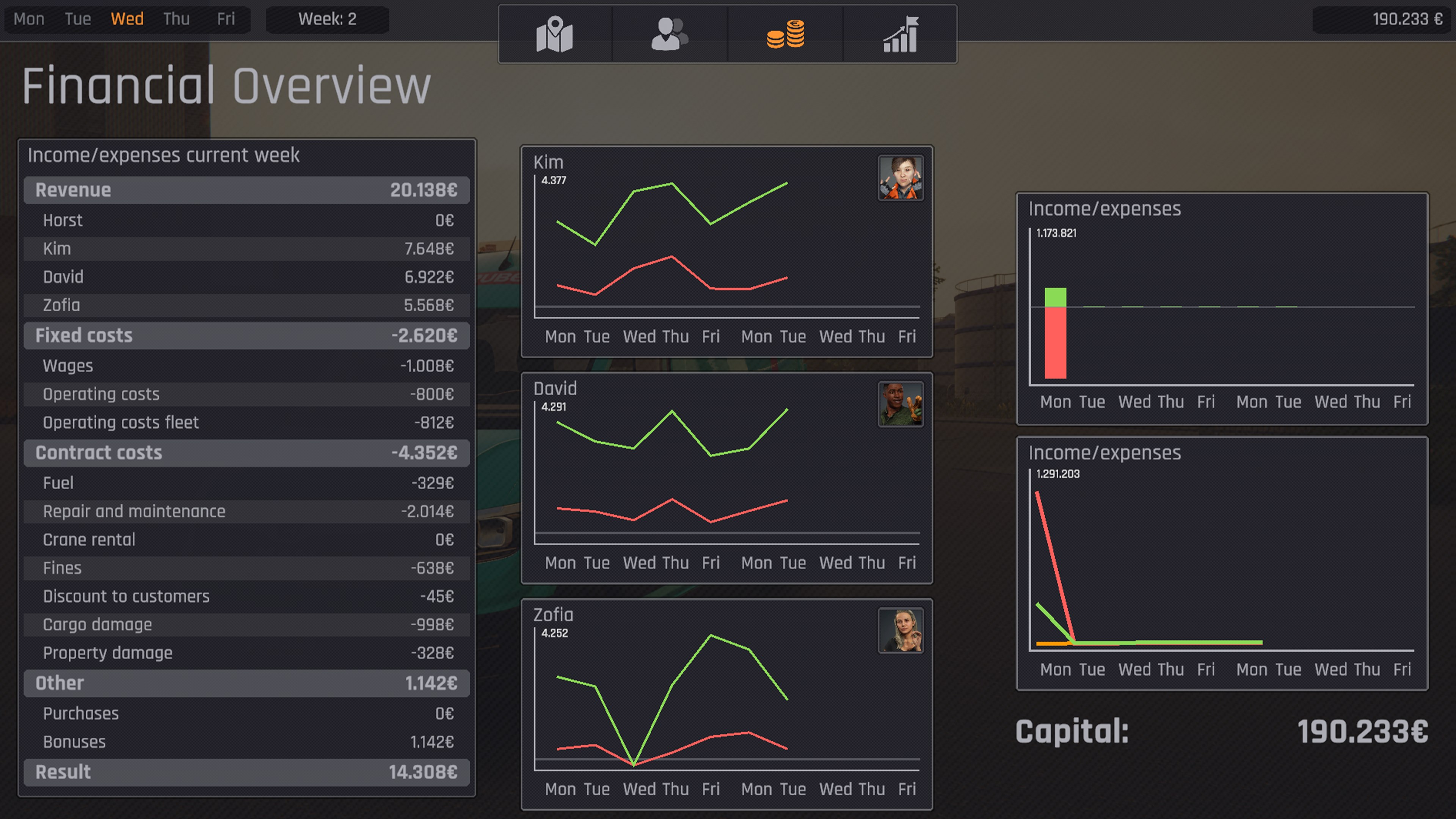 In Economy Mode, you manage your own company. You earn money by completing missions, hire employees, and expand your business step by step. You can purchase new trucks, trailers, and attachments to grow and customize your fleet. In addition, various milestones await you - by reaching them, you earn special rewards on top of the attachments unlocked after completing missions, allowing your company to grow even further.