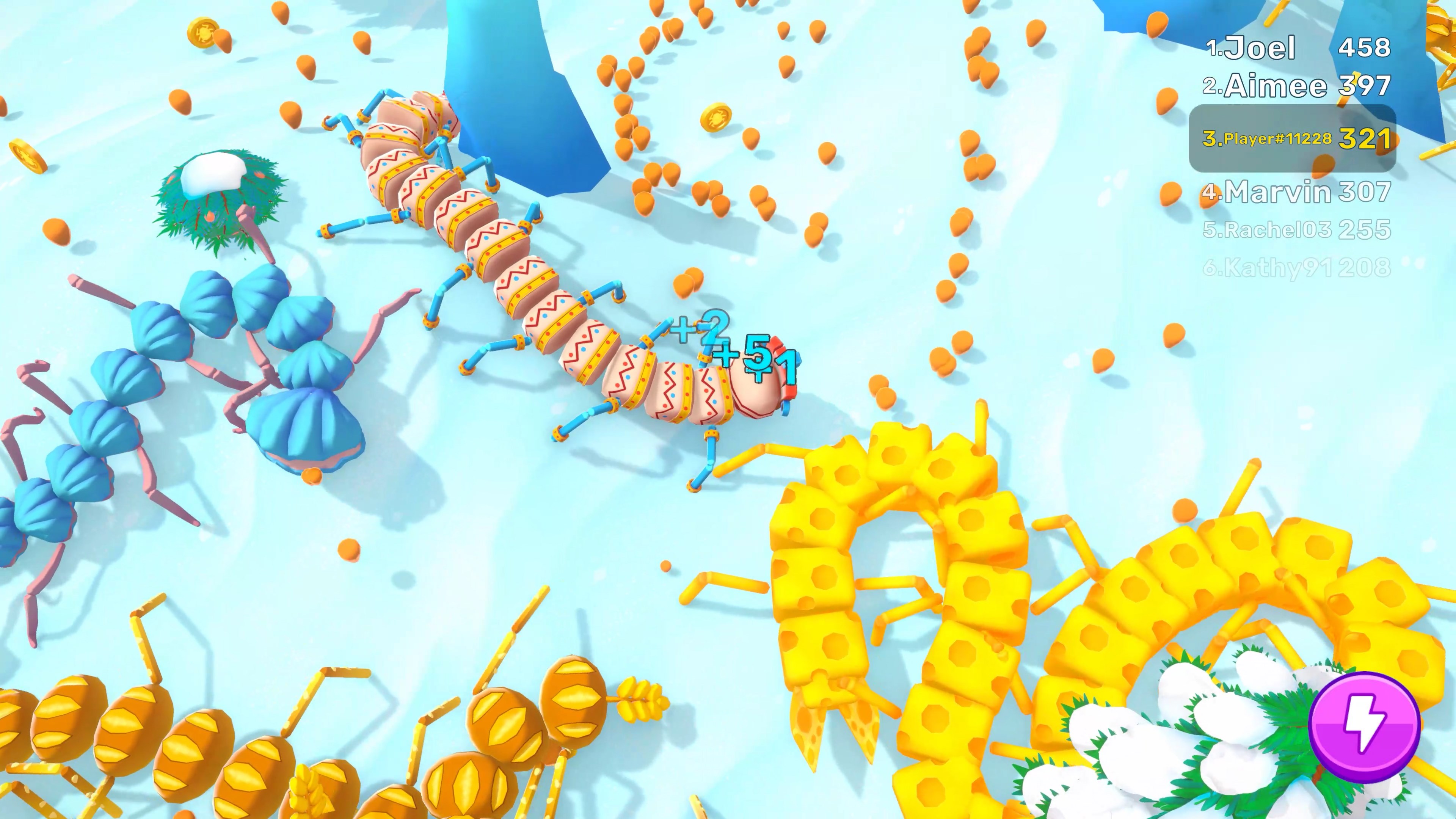 Get ready for an exciting adventure in the Arena, where giant Millipedes fight in thrilling battles. You can make your Millipede stronger and faster to outsmart and defeat your opponents. Fight against big and small enemies. Grow your Millipede, choose different skins and dominate the Arenas.