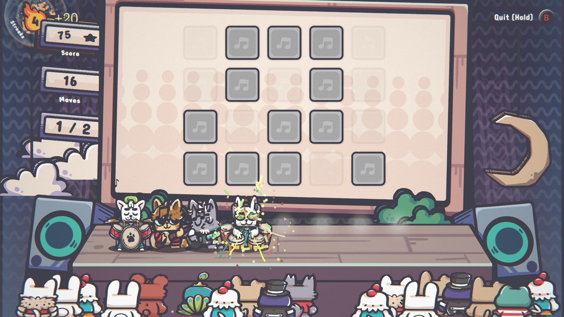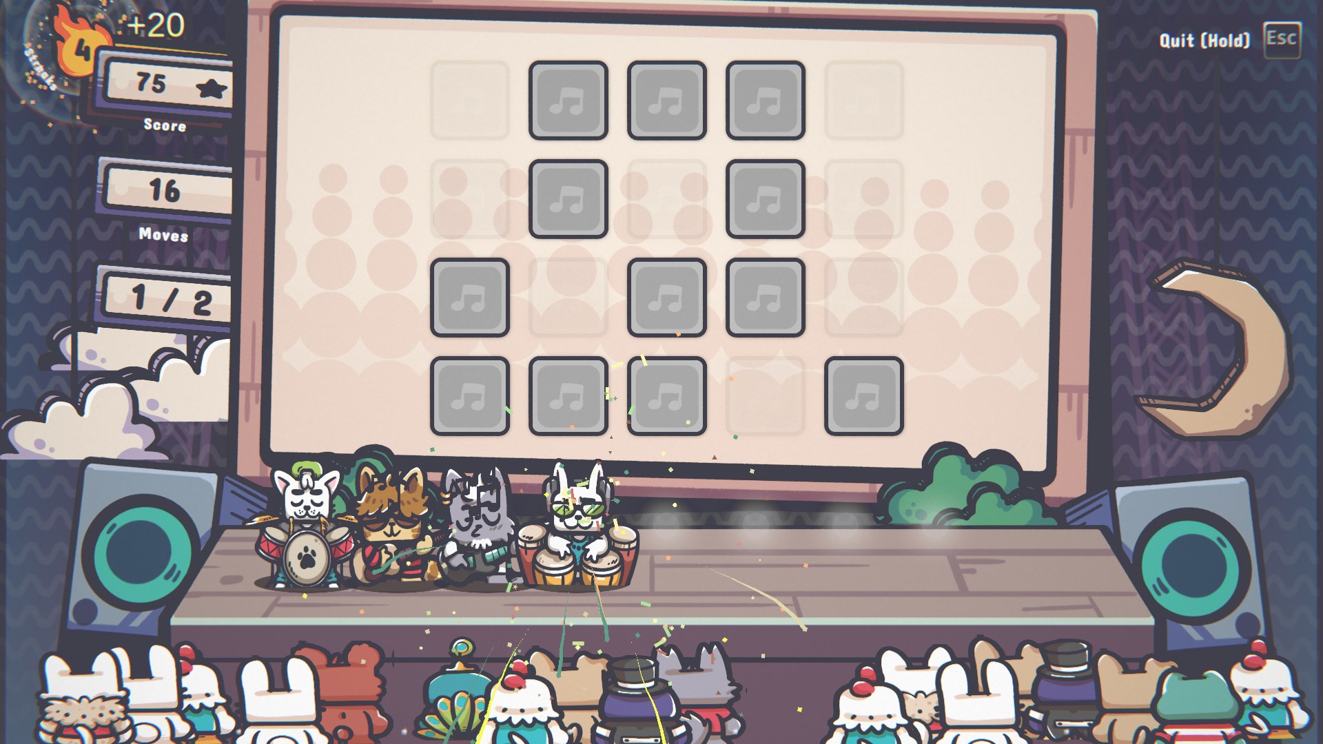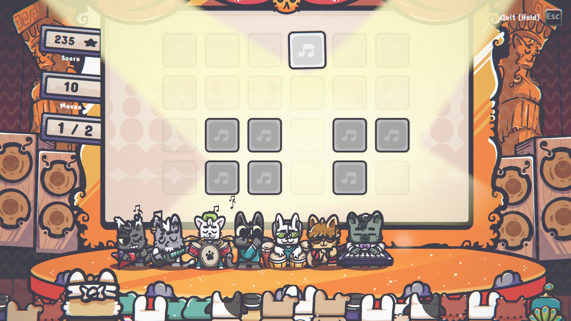 Manage a growing band of adorable musician cats across 15 levels with progressive difficulty, rising from small stages to big performances on a cozy feline tour.