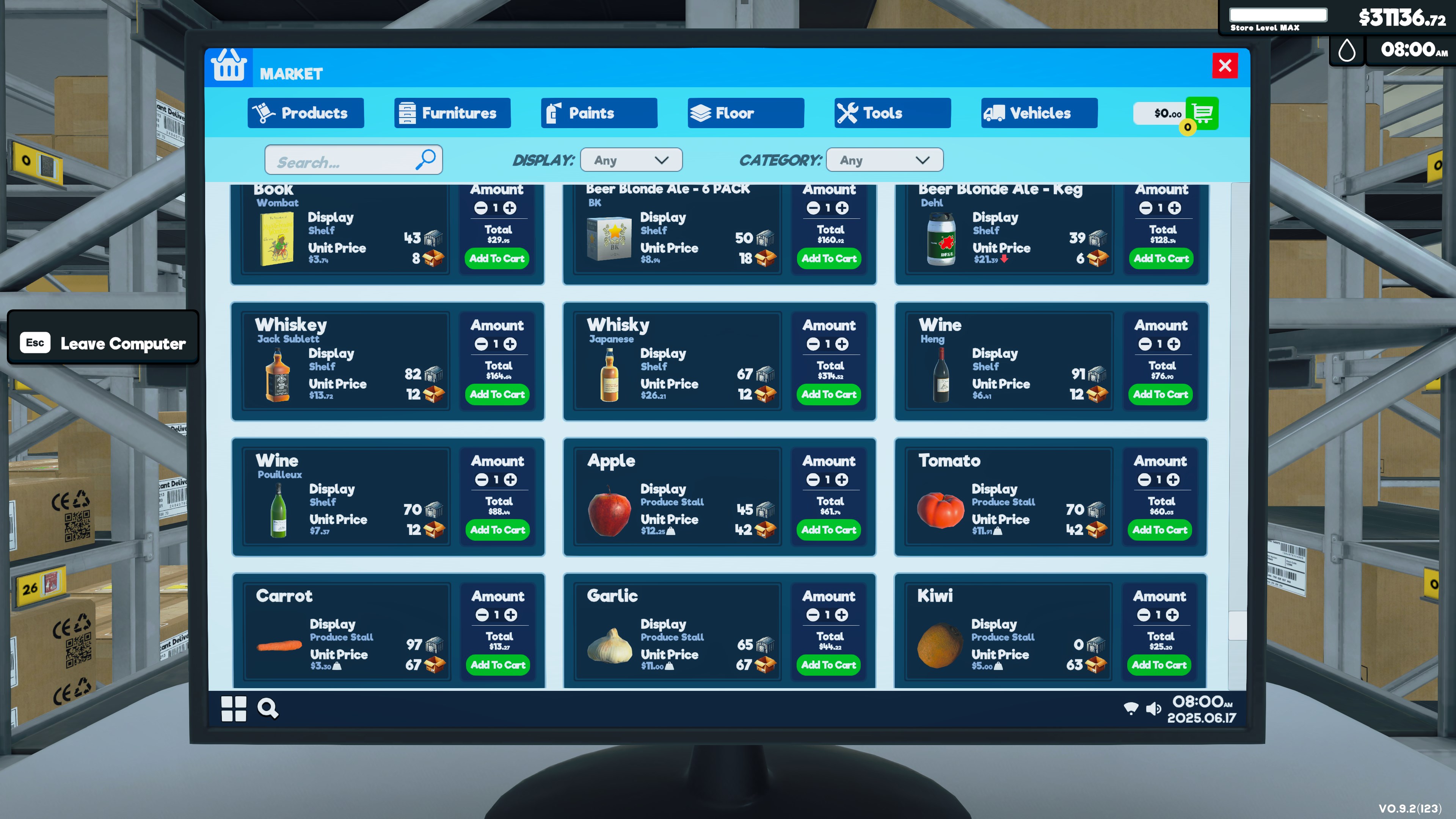 Order stock using an in-game computer. Unpack goods, organize them in your storage room and place them on shelves, fridges, and freezers.